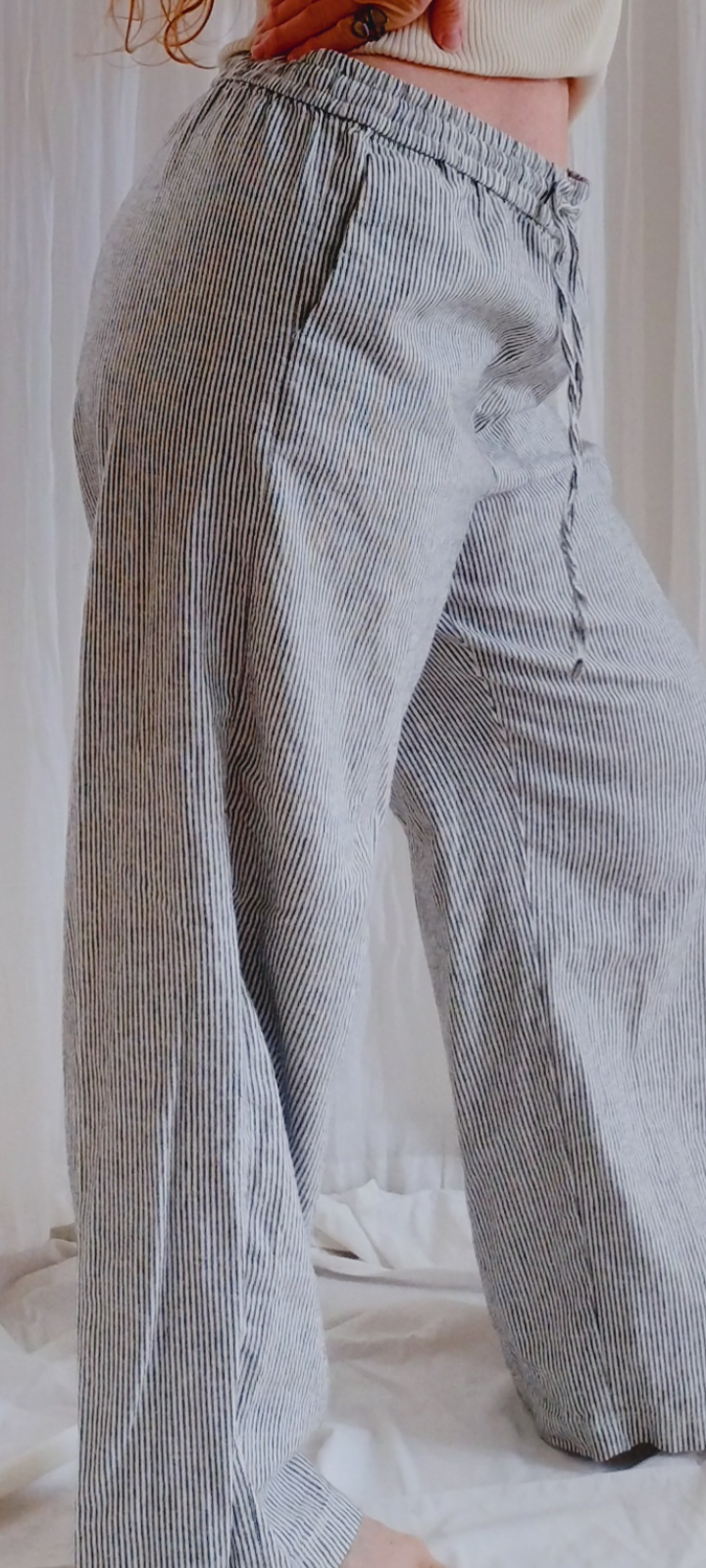 55% linen/45% cotton features side pockets and an elasticized waistband.